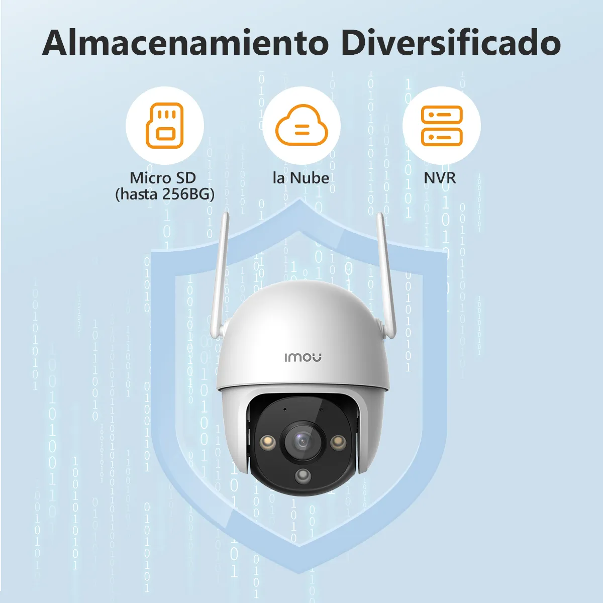 Ofrece almacenamiento flexible en microSD (hasta 256 GB), nube o NVR compatible con ONVIF, y conexión Wi-Fi 2.4 GHz para una instalación sencilla.